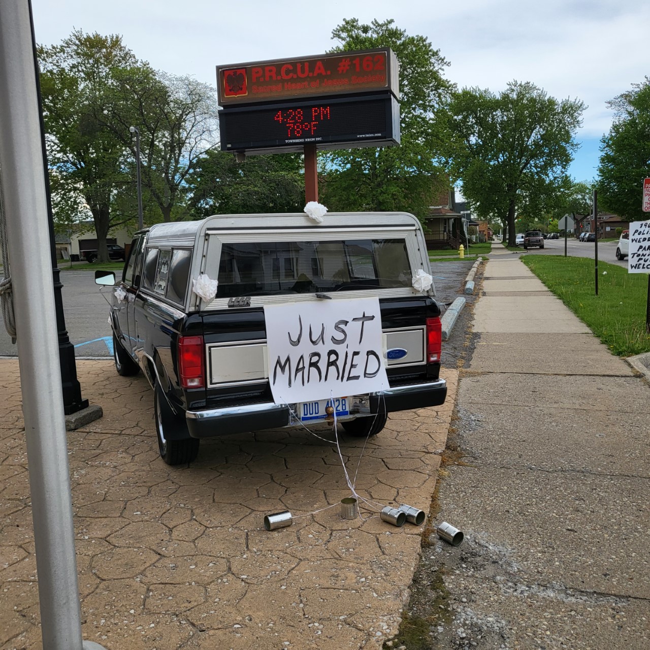 Outside the hall, a vintage Ford Ranger, courtesy of Society Director Lawrence A. Choraszewski, welcomed guests before they entered. The vintage truck was decorated with white tissue flowers and a JUST MARRIED SIGN propped up on the rear bumper, from which strings of curly white ribbon and empty tin cans were dangling. On a street signpost near the curb, Larry’s sign advertising the event brought in a few walk-ins who happened to be passing by.