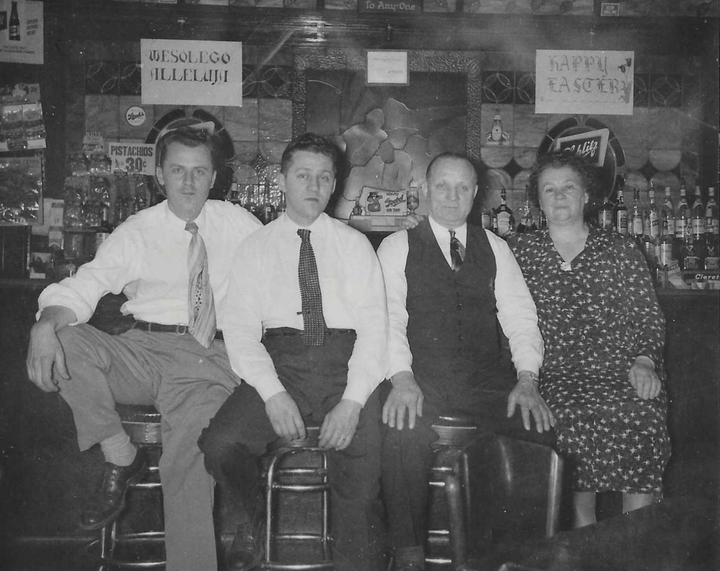 - Anthony (Tony), Walter, John, and Kathryn, at the bar inside Michno’s Café, ca. 1939, with WESOŁEGO ALLELUJA – HAPPY EASTER signs on the wall in the background.