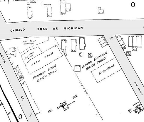 - Map depicting the Jacob Daniels [sic] Brick Yard (on the right) and the Francis Hyns Brick Yard (on the left), south of Chicago Road (or Michigan) and west of Martin Street. From Sanborn Fire Insurance Map from Detroit, Wayne County, Michigan. Sanborn Map Company, Vol. 5, 1884. Note the rather large kiln sheds on both properties. Source: https://www.atdetroit.net/forum/messages/62684/71657.html?1147962185