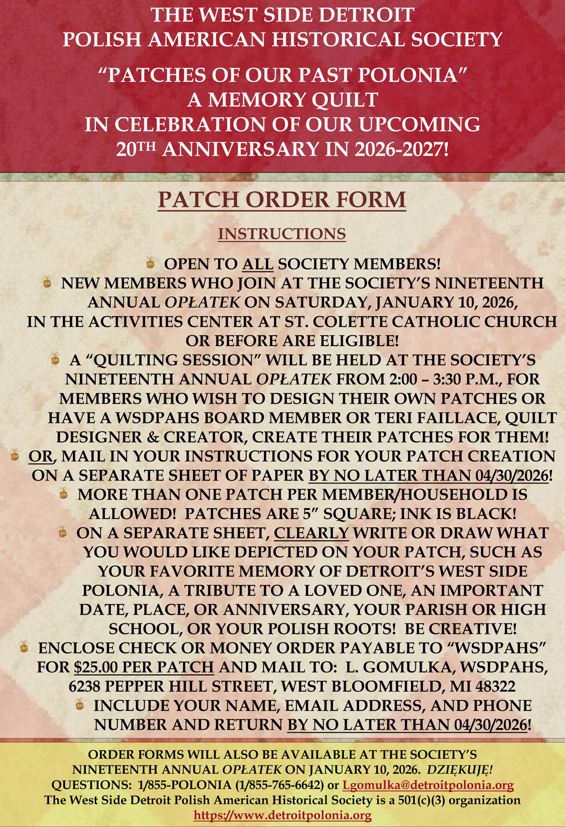 In celebration of the West Side Detroit Polish American Historical Society’s 20th Anniversary (2026–2027), all members are invited to participate in creating a special commemorative memory quilt.